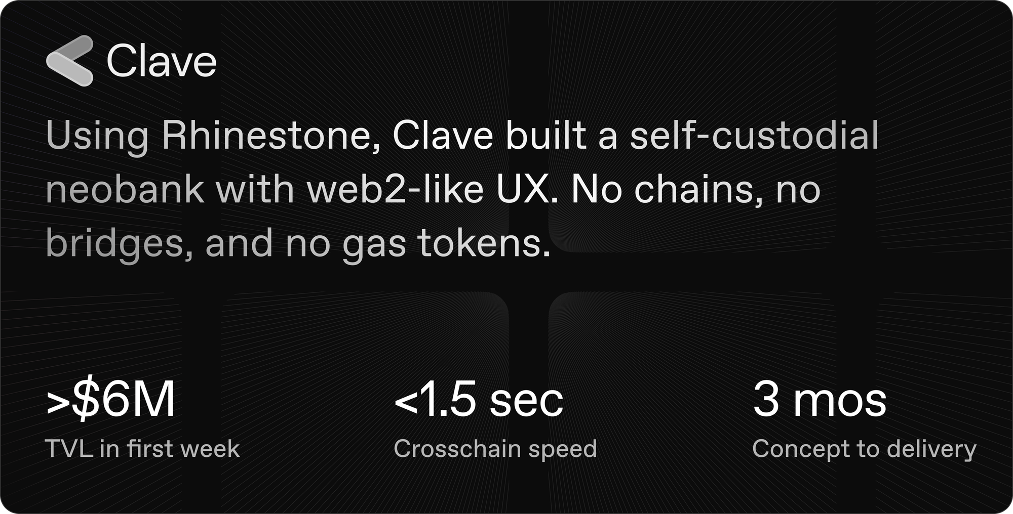 TL;DR: Clave builds on Rhinestone to realise its crypto neobank vision. With Rhinestone, Clave deploys, configures and manages smart accounts for best-in-class self-custody UX, and uses Warp (Rhinestone intents) to completely eliminate chains, bridging, and gas from the Clave V2 experience.