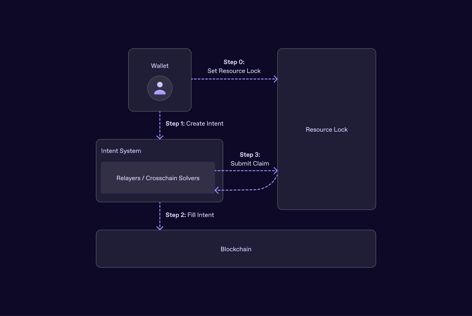 Note: Step 0 is only performed once, after which the user can submit any number of intents using the locked balance (steps 1-3).